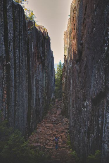 Wir haben die Gelegenheit genutzt, die Wanderschuhe geschnürt und haben uns auf den Weg zur Tärnättvattnen Hütte gemacht. Unser Weg hat uns auf dem gut ausgeschilderten Trail durch eine weitere Sehenswürdigkeit geführt, den Slåttdalsskrevan. Der Slåttdalsskrevan, eine etwa 200 Meter lange und 30-40 Meter tiefe Schlucht, ist im nördlichen Teil des Parks zu finden. Wo der Spalt heute klafft, wurde vor 1200 Millionen Jahren eine Diabaspassage gebildet. Flüssiges Magma drang aus dem Erdinneren ein und verfestigte sich. Die leichter verwitterte Diabasis ist seitdem erodiert.