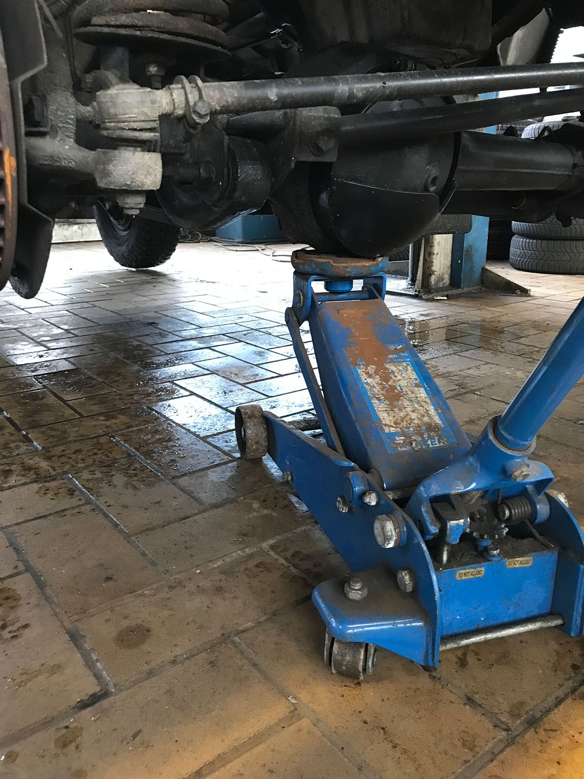 • Räder demontieren und Fahrzeug aus den Federn heben, entweder per Hebebühne oder Wagenheber